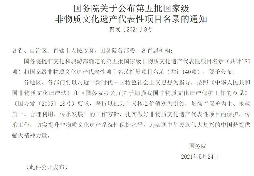 近日,国务院批准文化和旅游部确定的第五批国家级非物质文化遗产代表性项目名录(共计185项)和国家级非物质文化遗产代表性项目名录扩展项目名录(共计140项)公布。
