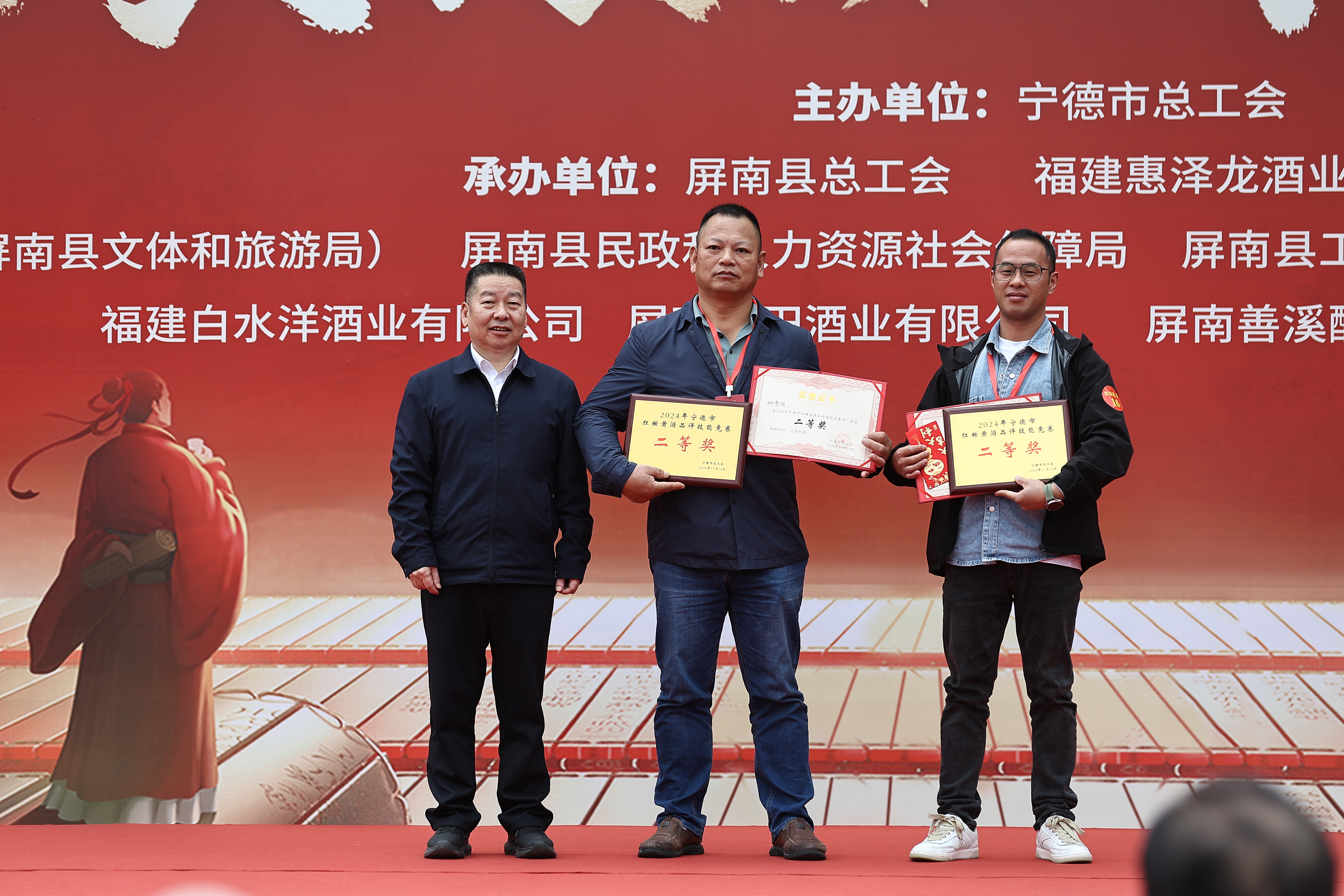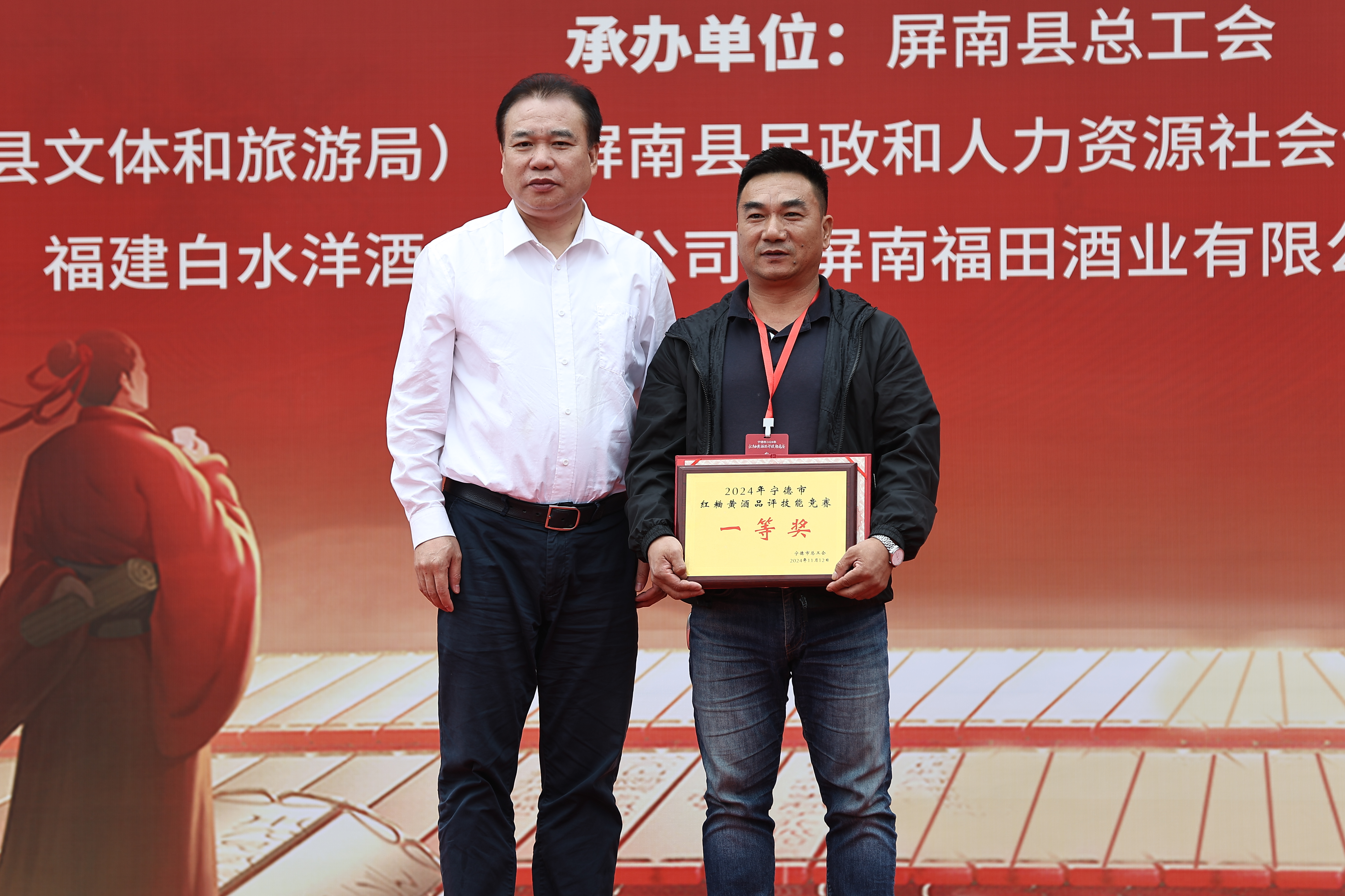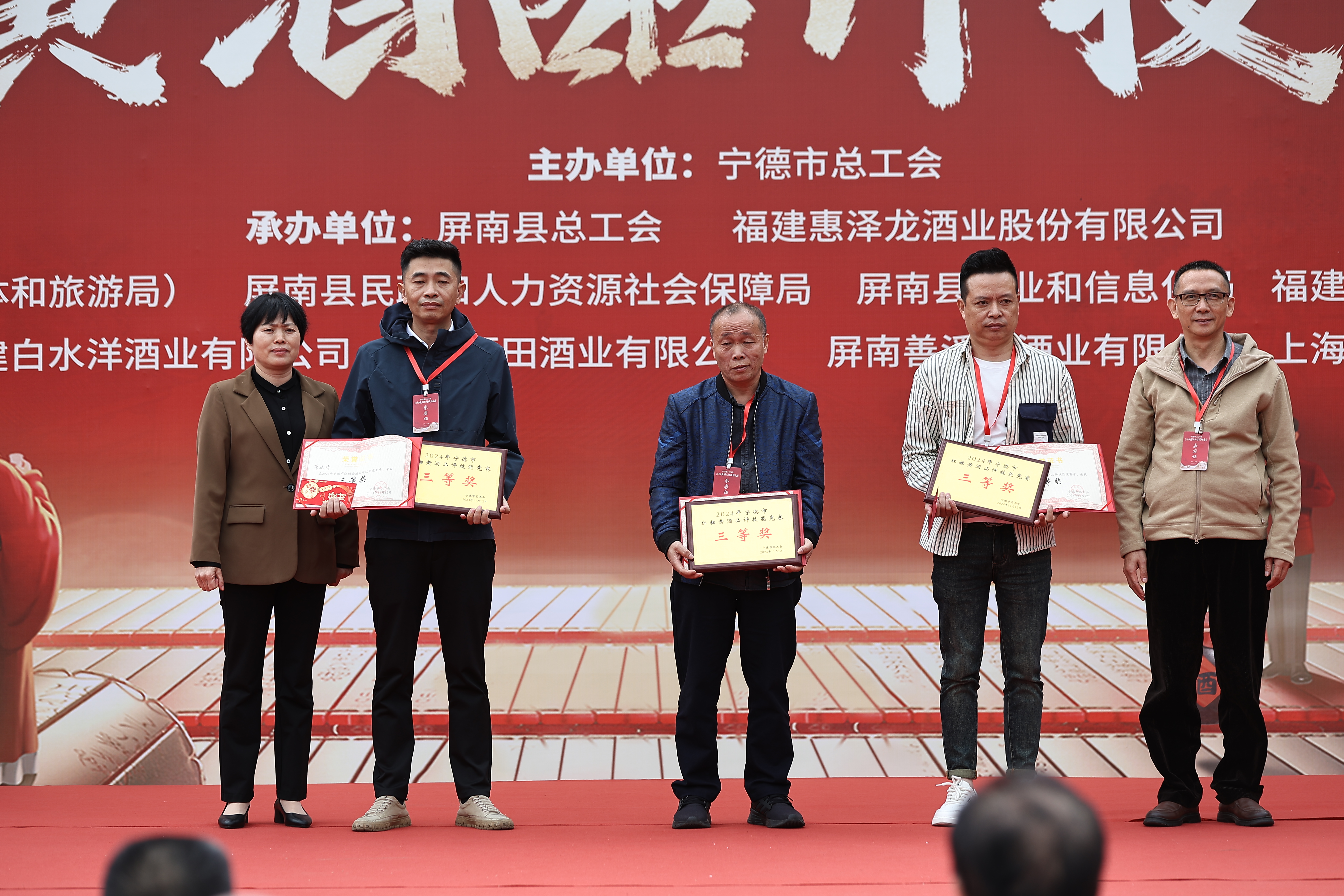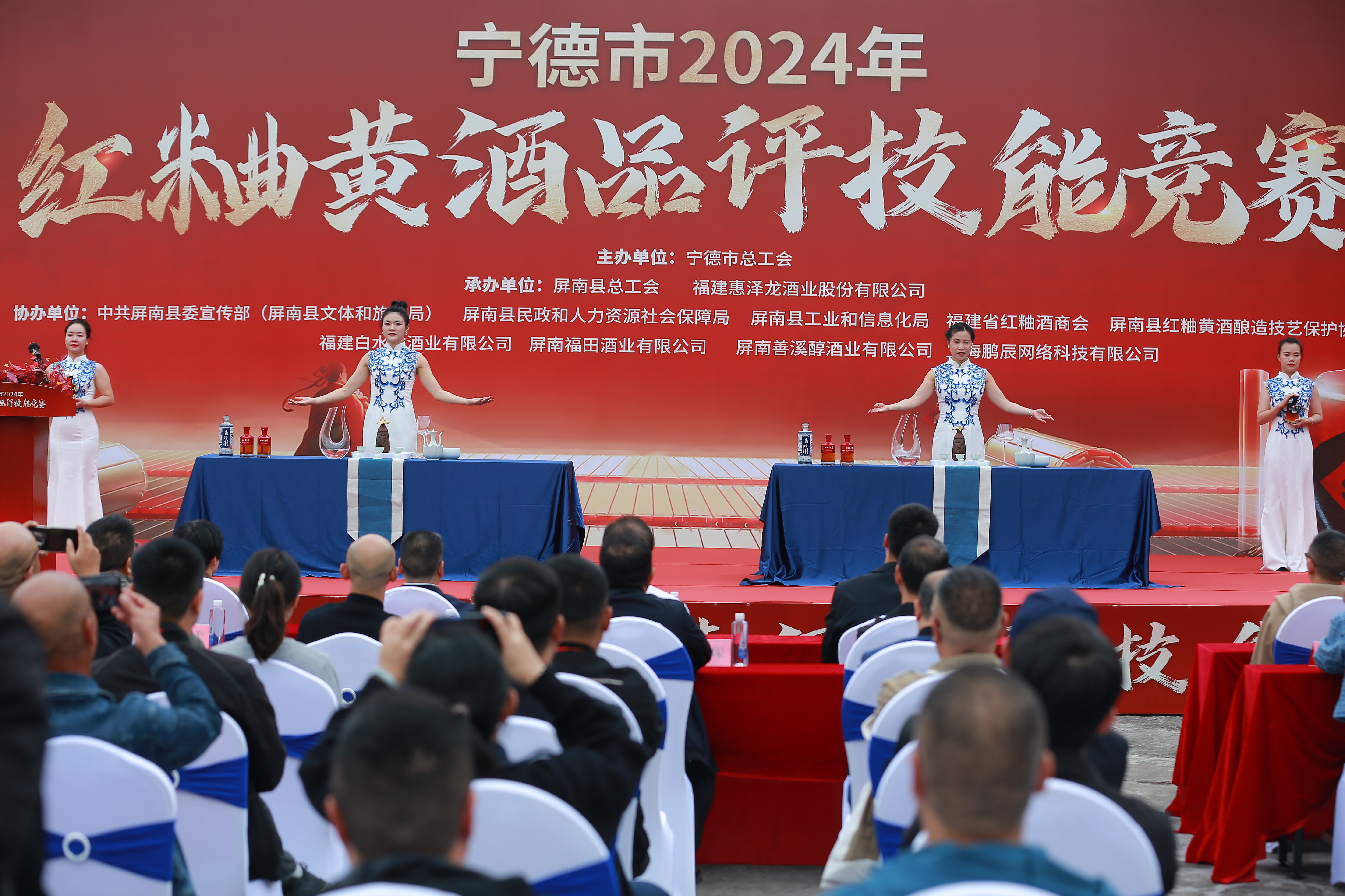 2024年11月12日,宁德市2024年红粬黄酒品评技能竞赛在屏南县隆重举办。由宁德市各县(市、区)、东侨经济技术开发区总工会组织的28名选手参加竞赛。本次竞赛由宁德市总工会主办,屏南县总工会、福建惠泽龙酒业股份有公司承办,中共屏南县委宣传部(屏南县文体和旅游局)、屏南县民政和人力资源社会保障局、屏南县工业和信息化局、福建省红粬酒商会、屏南县红粬黄酒酿造技艺保护协会、福建白水洋酒业有限公司、屏南福田家酒酒业有限公司等单位协办。